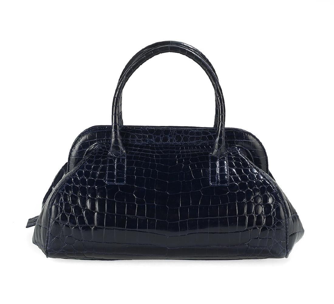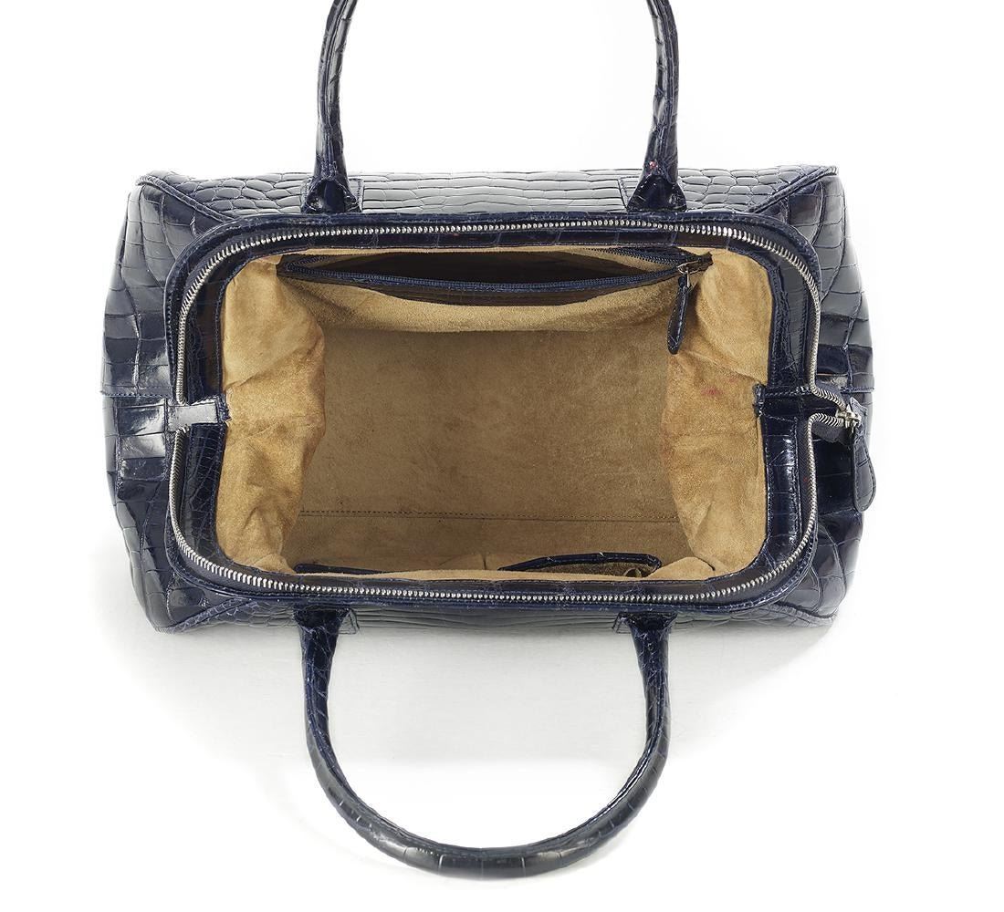silver hardware, zippered closure, tan suede interior with two cell phone pockets and a zippered pocket stamped: "Alexandra Knight", resting on five metal feet, includes a labeled dustbag.