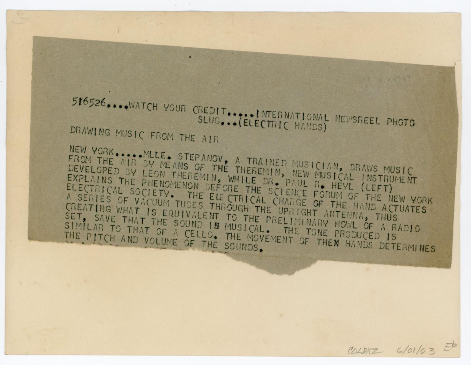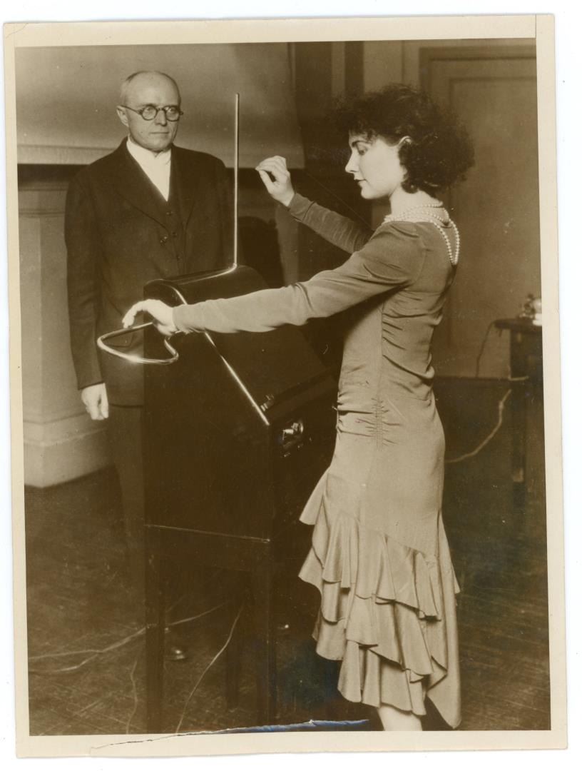 Unusual Musical Instrument. 6" by 8". Alexandra Stepanoff was one of Leon Theremin's first theremin students in the United States. Formerly a concert singer, around the late twenties, she moved from Russia to New York, where, thanks to the local Russian community, she met Léon Théremin. Stepanoff participated in the 1928 open-air concert at New York's Lewisohn Stadium, as a member of the theremin quartet (formed, besides her, by Theremin himself, Julius Goldberg and the Russian emigrant Moissaye Olgin) that played along with the New York Philharmonic-Symphony Orchestra.