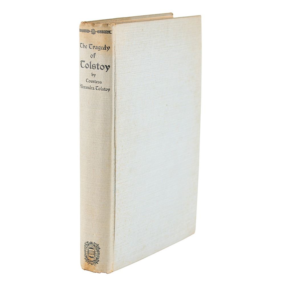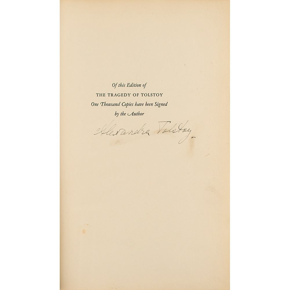 Youngest daughter (1884–1979) and secretary of the noted Russian novelist Leo Tolstoy. Signed book: The Tragedy of Tolstoy. First edition, limited issue of 1000. New Haven, CT: Yale University Press, 1933. Hardcover, 6.25 x 9.5, 294 pages. Signed on the colophon in fountain pen, "Alexandra Tolstoy." In very good to fine condition, with light soiling to the signature area, some foxing to boards, first free end page curiously excised, and stains to top and bottom of spine.