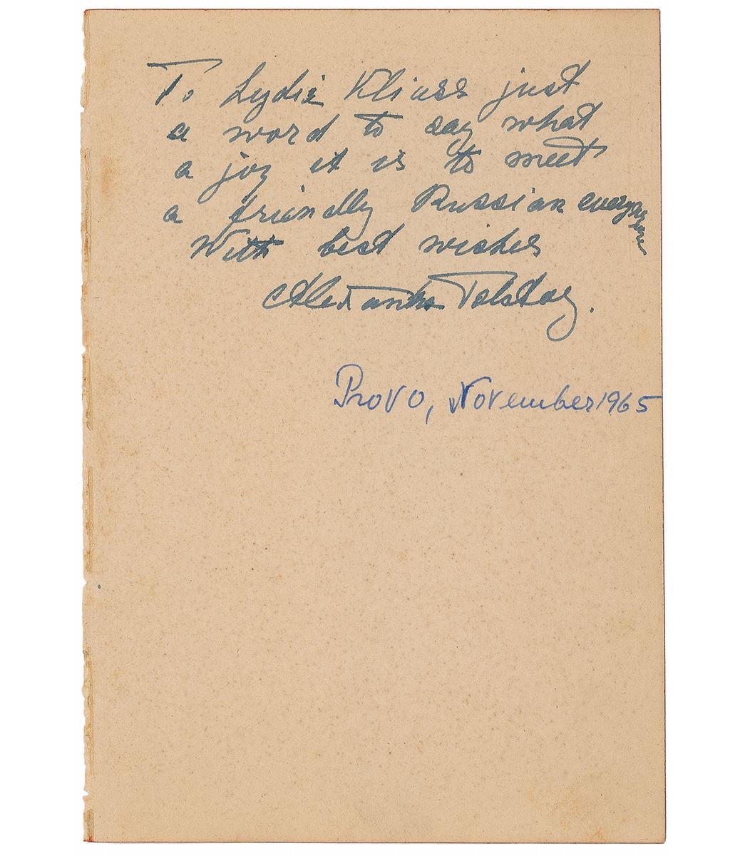 Youngest daughter (1884–1979) and secretary of the noted Russian novelist Leo Tolstoy. Ink signature and inscription, “To Lydie Kliuss, just a word to say what a joy it is to meet a friendly Russian everywhere. With best wishes, Alexandra Tolstoy,” on an off-white 5.5 x 8 page removed from a book, bearing a collector’s date notation of November 1965. In fine condition, with light foxing and toning.