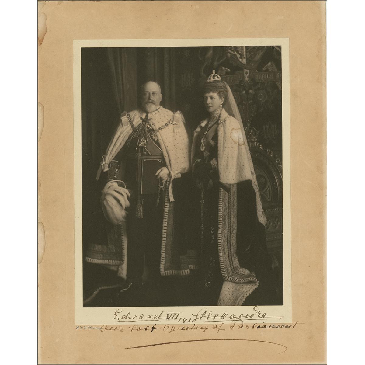 Vintage matte-finish 6.5 x 8.5 photo of the King and Queen by W. & D. Downey, and affixed to its original 8.75 x 11 mount, signed in black ink,“ Alexandra,” who also signs “Edward VIII,” on behalf of her husband adding under their signatures, “1910, Our last opening of Parliament.” In very good to fine condition, with a water spot to image, scattered toning and soiling to mount, with scattered damp staining to the edges.