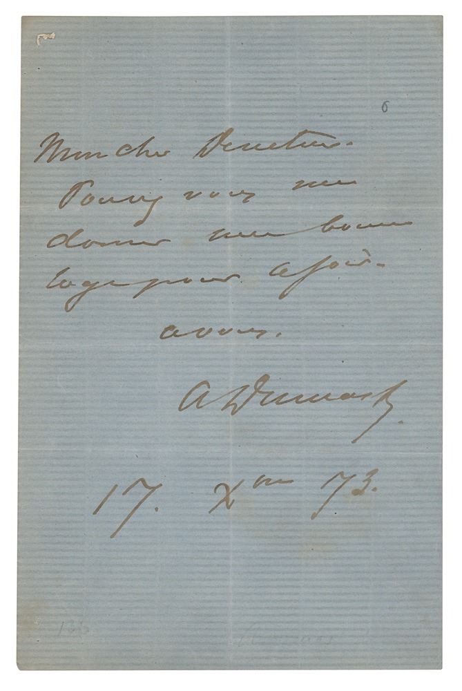 ALS in French, signed "A Dumas f.," one page, 5.25 x 8.25, December 17, 1873. Untranslated handwritten letter by Alexandre Dumas, fils. In fine condition, with intersecting folds.