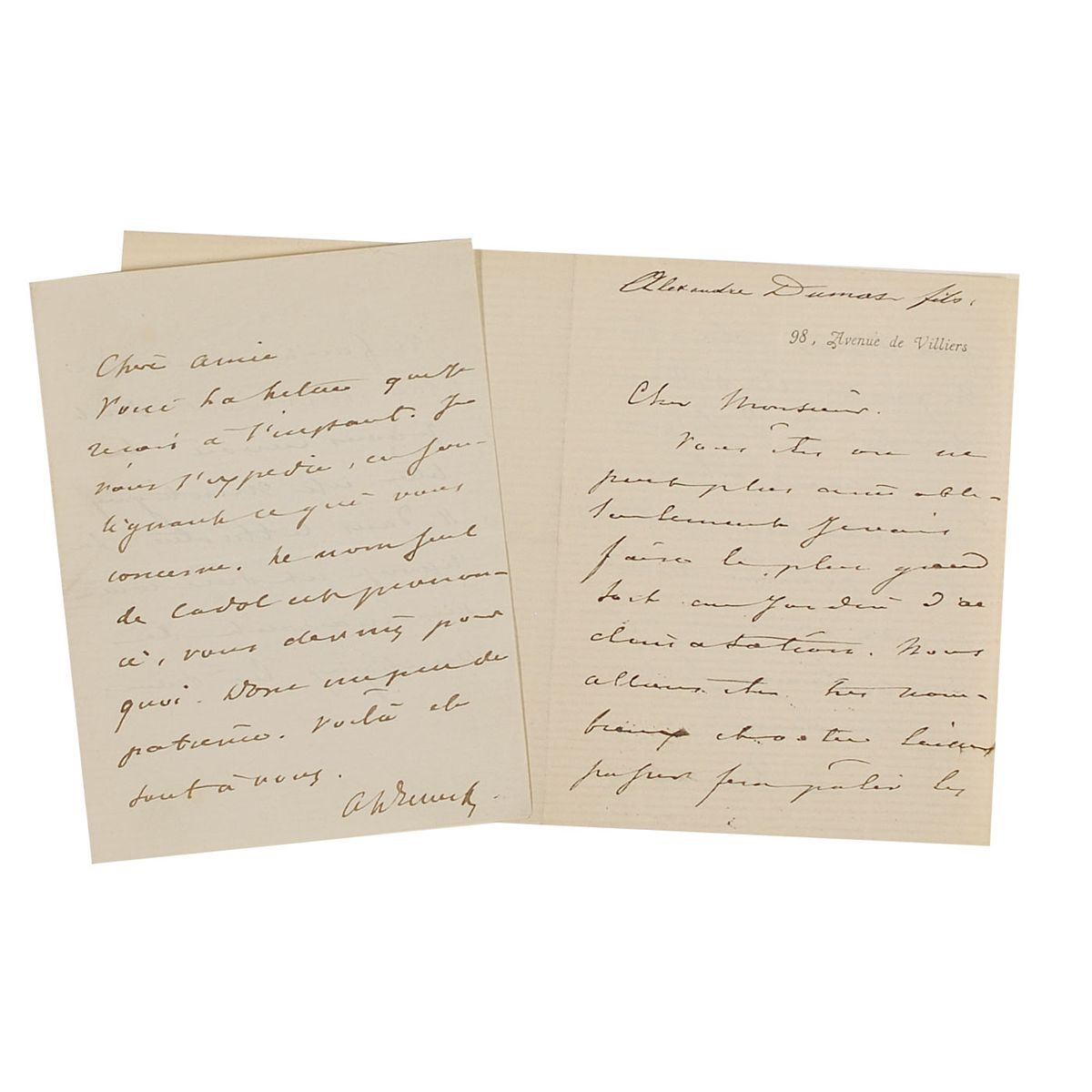 Two elegant untranslated ALSs in French, each signed “A. Dumas,” both one page, both sides, 4 x 5. Uniform toning, light soiling, and wrinkling, otherwise fine condition.