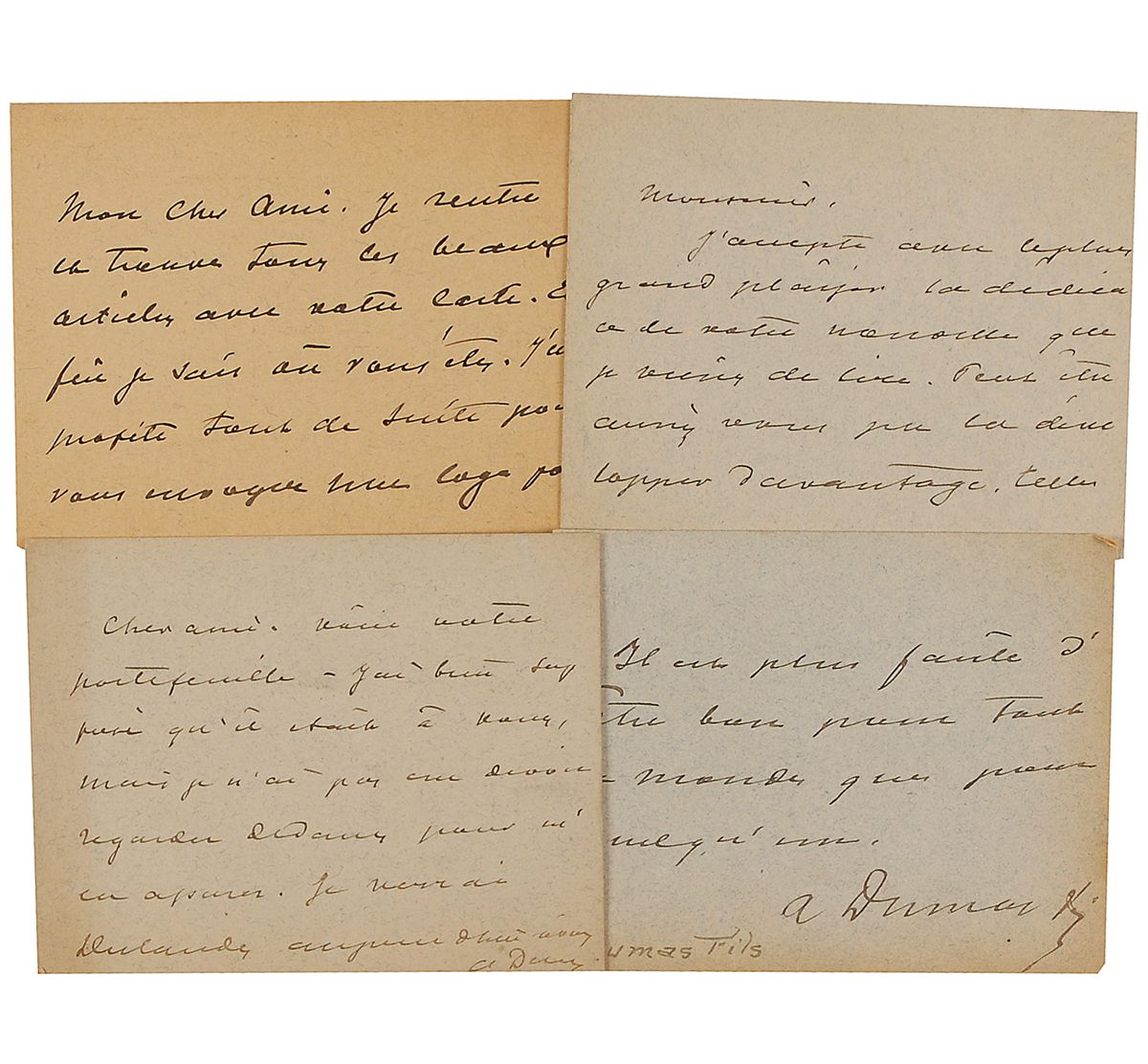 Four untranslated ALSs in French, each signed “A. Dumas,” on 4.5 x 3.5 cards, two one-page letters and two one-page both sides. In overall fine condition, with scattered toning, a few pencil notations, and mounting remnants and surface loss to the reverse of one of the one-page letters. Accompanied by the original mailing envelope for one of the cards, filled out in Dumas’s hand.