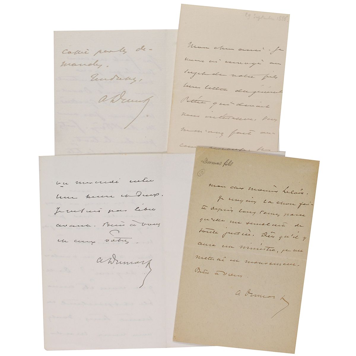 Four untranslated ALSs in French, each signed “A. Dumas,” on sheets ranging in size from 3.75 x 6 to 4.25 x 7, three one-page both sides and the other one page. In overall fine condition. Accompanied by one original mailing envelope, addressed in his own hand.