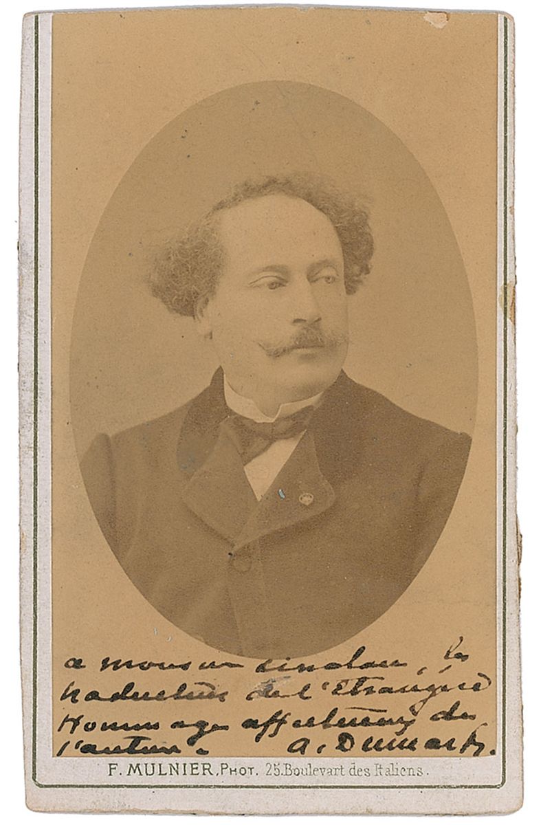 French writer and dramatist (1824–1895) best known for Camille and for being the illegitimate son of famed novelist Alexandre Dumas. Uncommon 2.25 x 3.75 carte-de-visite bust portrait of Dumas, lengthily signed and inscribed in French at the bottom of the image in black ink. Published by F. Mulnier of Paris. Noticeably trimmed top edge and heavy mounting remnants to reverse, otherwise fine condition.