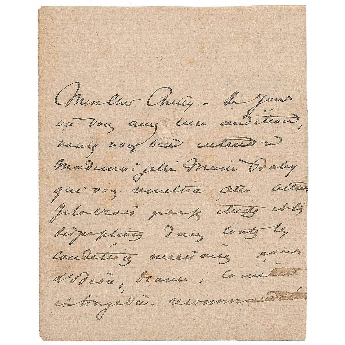 French writer and dramatist (1824–1895) best known for Camille and for being the illegitimate son of famed novelist Alexandre Dumas. Untranslated ALS in French, signed “A Dumas, fils,” one page both sides, 4 x 5, no date. In fine condition, with some scattered light toning, which does not affect the legibility.