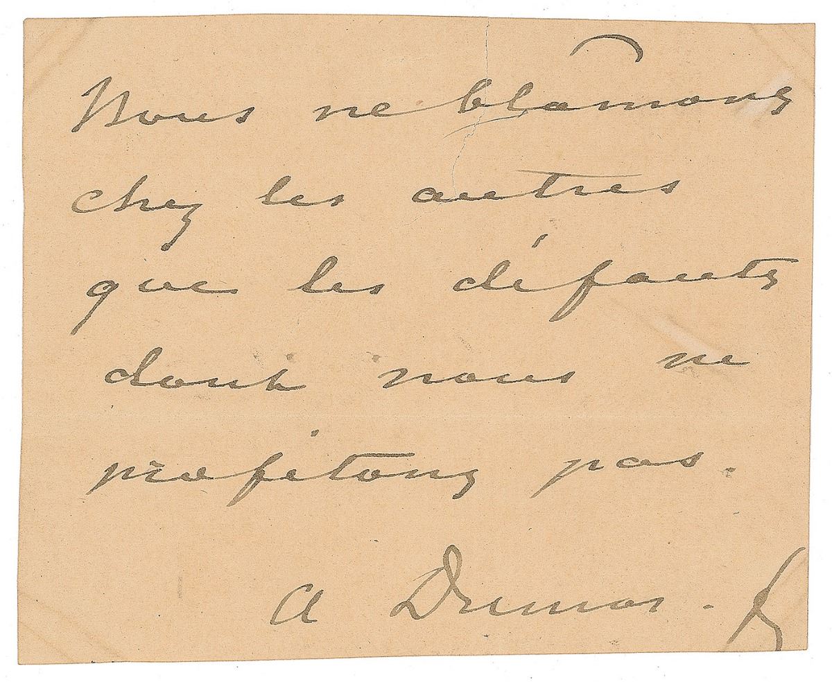 French writer and dramatist (1824–1895) best known for Camille and for being the illegitimate son of famed novelist Alexandre Dumas. AQS in French on an off-white 3.5 x 2.75 slip, signed, “A. Dumas.” In full (translated): "We only blame others for faults from which we do not ourselves benefit.” In fine condition, with an unobtrusive vertical tear repaired with archival tape on the reverse.