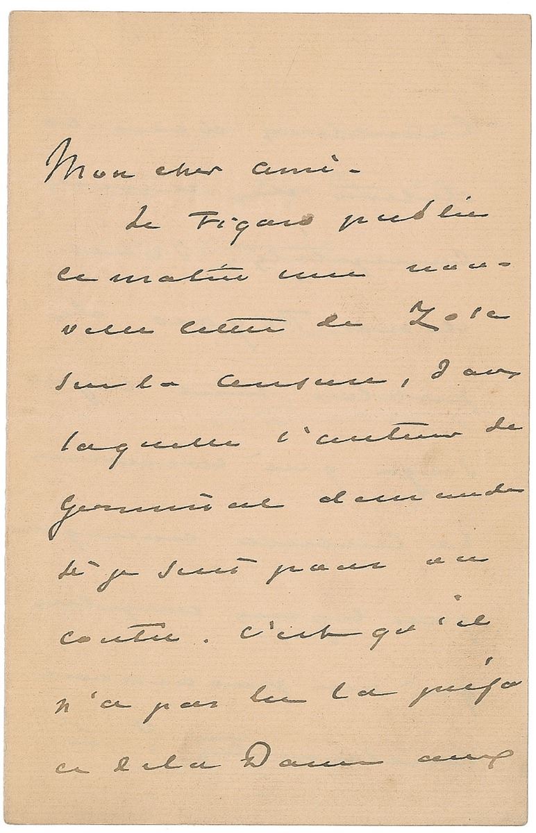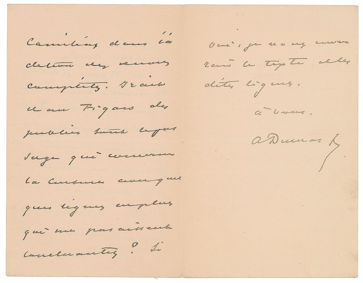 French writer and dramatist (1824–1895) best known for Camille and for being the illegitimate son of famed novelist Alexandre Dumas. ALS in French, signed “A. Dumas,” three pages on two adjoining sheets, 4.5 x 7, no date. Letter to the editor of Le Figaro, in part (translated): "Today Le Figaro has published another letter by Zola about censorship in which the author of Germinal asks whether I’m for or against it. That’s because he hasn’t read the preface to ‘The Lady of Camelias.’ Is it possible for Le Figaro to publish the entire passage concerning censorship?” In fine condition. The publication of The Lady of Camelias, known in English as Camille, was considerably delayed as Dumas struggled with official censors over the romantic subject matter.