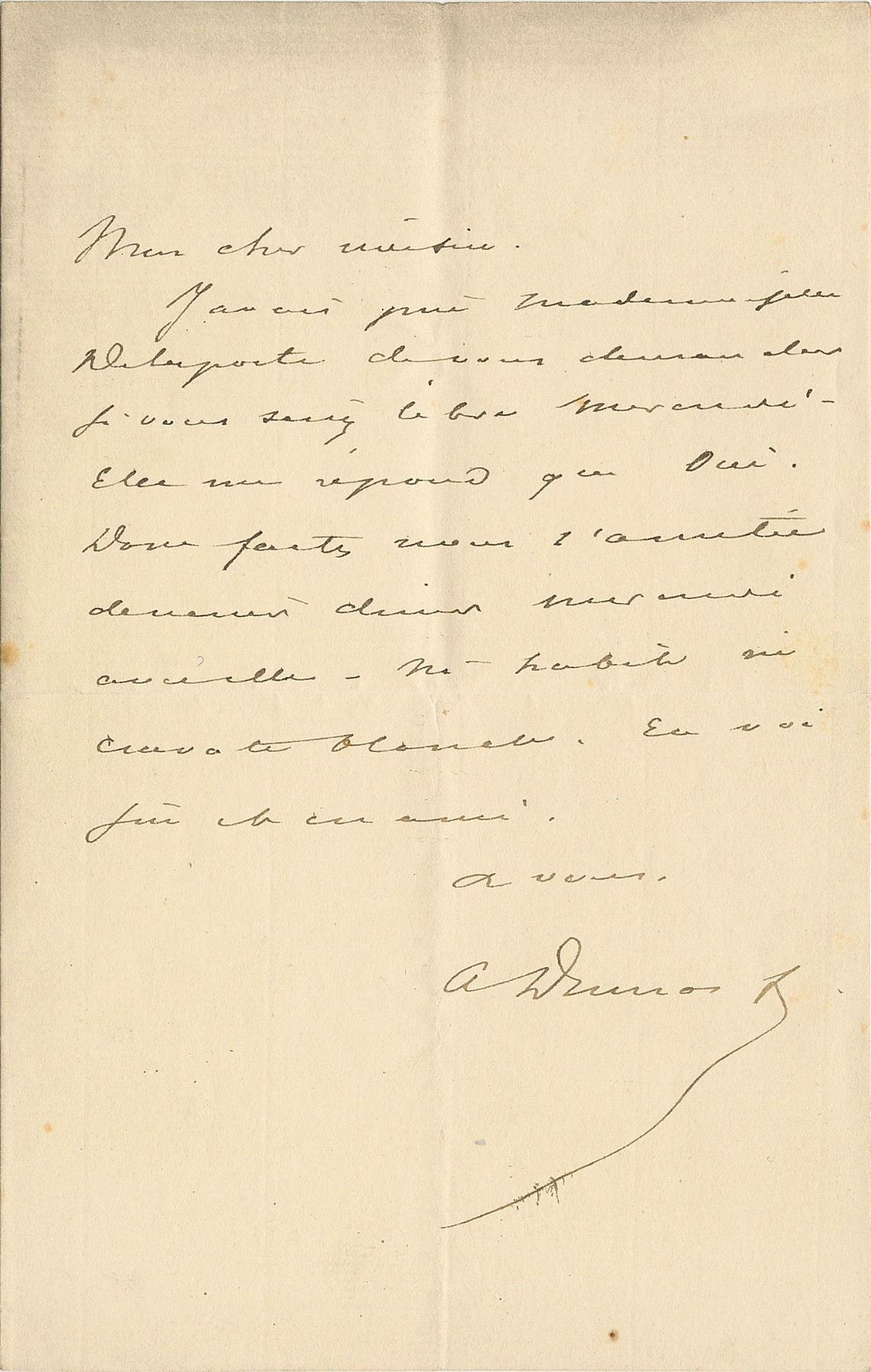 French writer and dramatist (1824–1895) best known for Camille and for being the illegitimate son of famed novelist Alexandre Dumas. Untranslated ALS in French, signed “A. Dumas f.,” one page, 5 x 8, no date. In fine condition, with light edge toning.