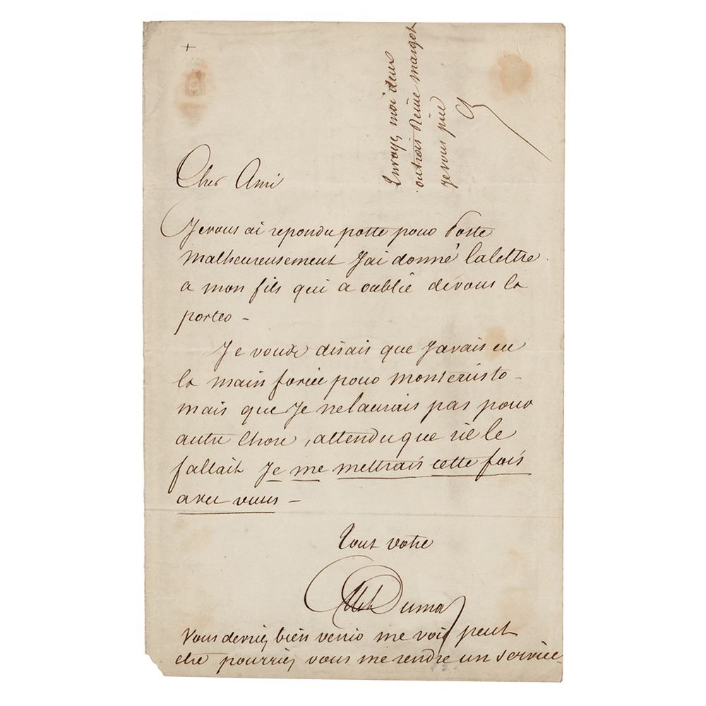 ALS in French, signed "Alec. Dumas," one page, 5.25 x 8.25, no date. Untranslated handwritten letter by Alexandre Dumas, pere. Dumas adds an initialed postscript to the upper right. In fine condition, with two small spots of toning (and an associated small tear) to the top margin. Accompanied by a full letter of authenticity from PSA/DNA.