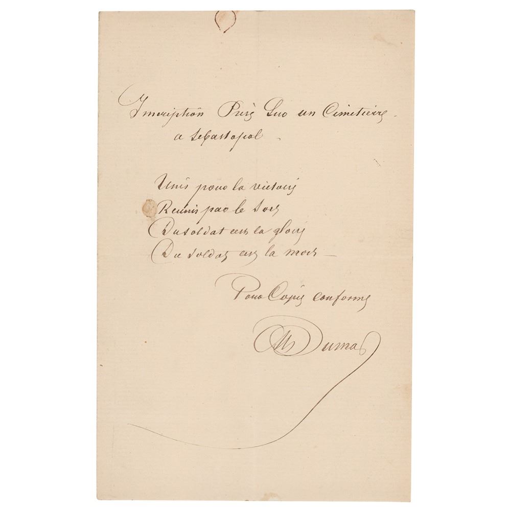 AQS in French, signed "Al. Dumas," one page, 5.25 x 8.25, no date. Dumas writes, in full (translated): "Inscription taken from a cemetery in Sebastopol: United for the victory / Reunited in the evening / Of the soldier is the glory / Of the soldier is the more." In fine condition, with a small stain, and a rusty paperclip impression to the top edge.