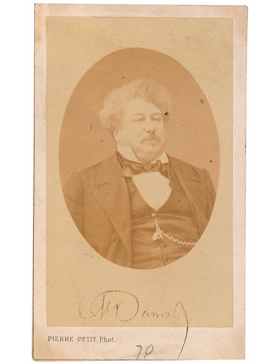 Distinguished French novelist (1802–1870) of such historical classics as The Count of Monte Cristo, The Three Musketeers, and The Man in the Iron Mask. Rare original 2.5 x 4 carte-de-visite photo by Pierre Petit of Paris, signed at the bottom of the image in black ink, “A. Dumas.” Some scattered light surface marks and soiling to front, small pencil notation along bottom edge, dampstaining to reverse, and some light irregular ink adhesion to signature, otherwise fine condition. Just the third signed portrait of Dumas (pere) we have seen.