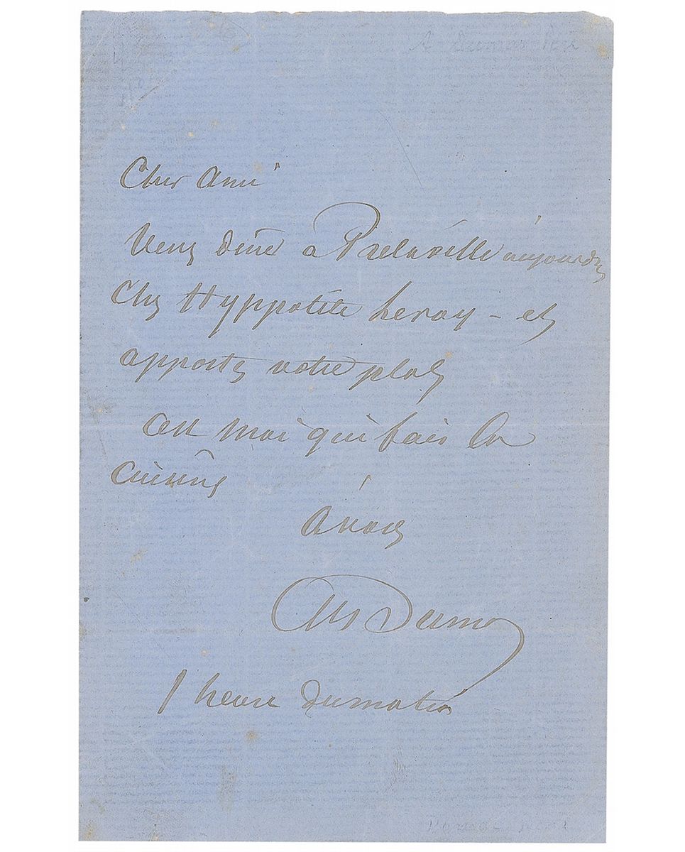 Distinguished French novelist (1802–1870) of such historical classics as The Count of Monte Cristo, The Three Musketeers, and The Man in the Iron Mask. ALS in French, signed “Alex Dumas,” one page, 4 x 6.25, no date. Brief letter to a friend. In full (translated): “Come dine at Prelaville today at Hyppolite Leroy’s—and bring your dish with you. I’ll be doing the cooking.” Scattered light creases, wrinkling, and toning, otherwise fine condition. Dumas was a renowned cook and wrote a ‘Dictionnaire de Cuisine.’