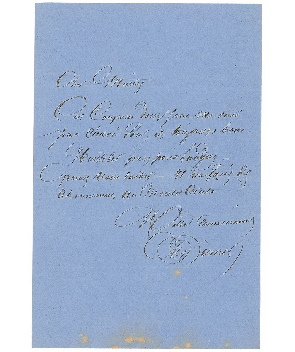 ALS in French, signed “A. Dumas,” one page, 5.25 x 8, no date but likely circa mid to late 1840s. In full (translated): “Are these coupons which I have not used still valid? Herstoler is leaving for London‚ can you be of assistance to him? He is going to secure some subscriptions to Monte Cristo.” In fine condition, with scattered discolored spots at the bottom. Dumas’s famous adventure novel The Count of Monte Cristo was first serialized in the Journal des Debats. A great letter regarding the publication of the novel which quickly became the most popular book in Europe.