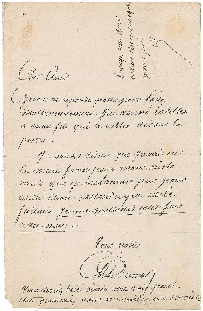 Untranslated ALS in French, signed “Alec. Dumas,” one page, 5.25 x 8.25, no date. Dumas adds an initialed postscript to the upper right. In very good to fine condition, with a small tear to top margin.
