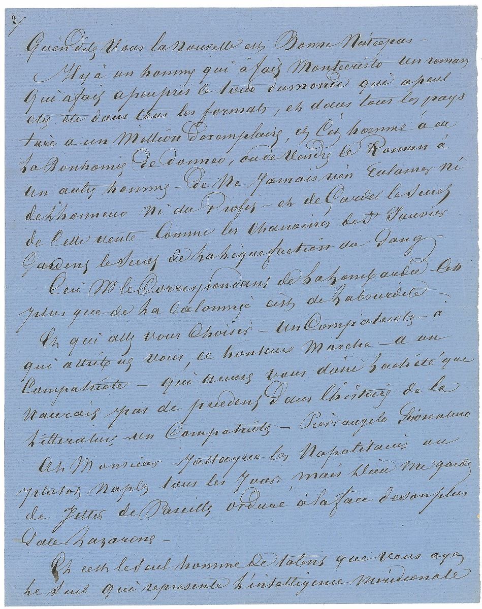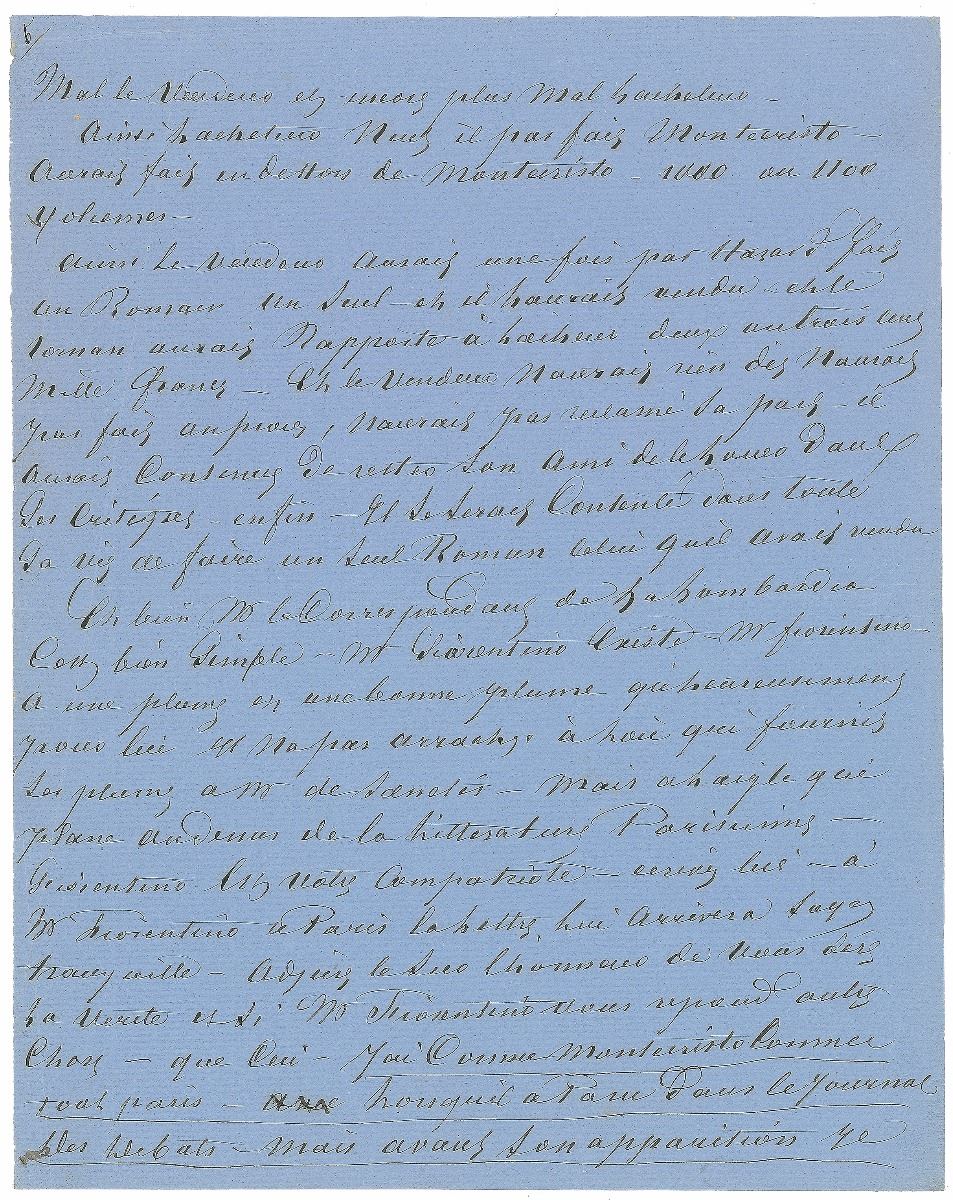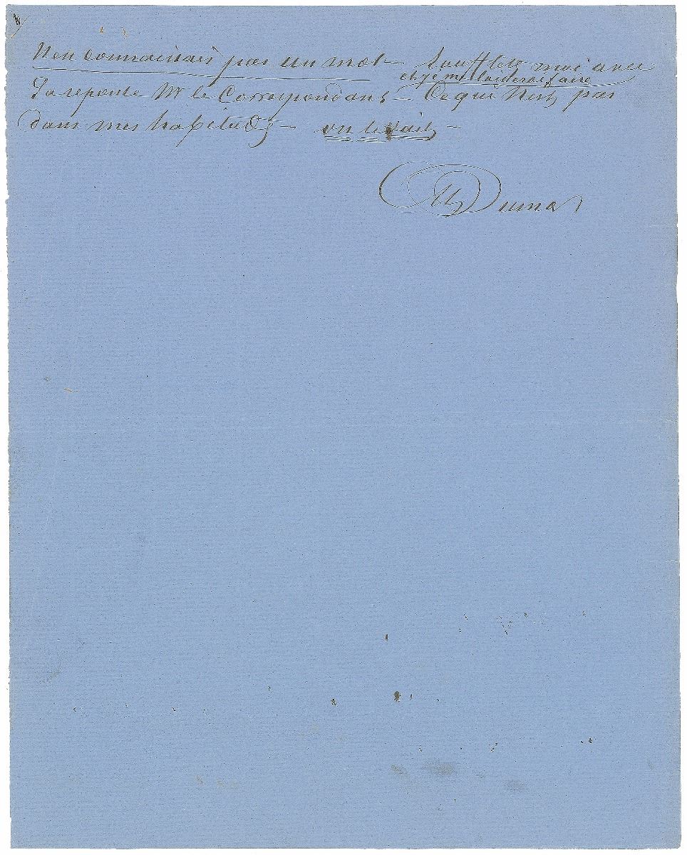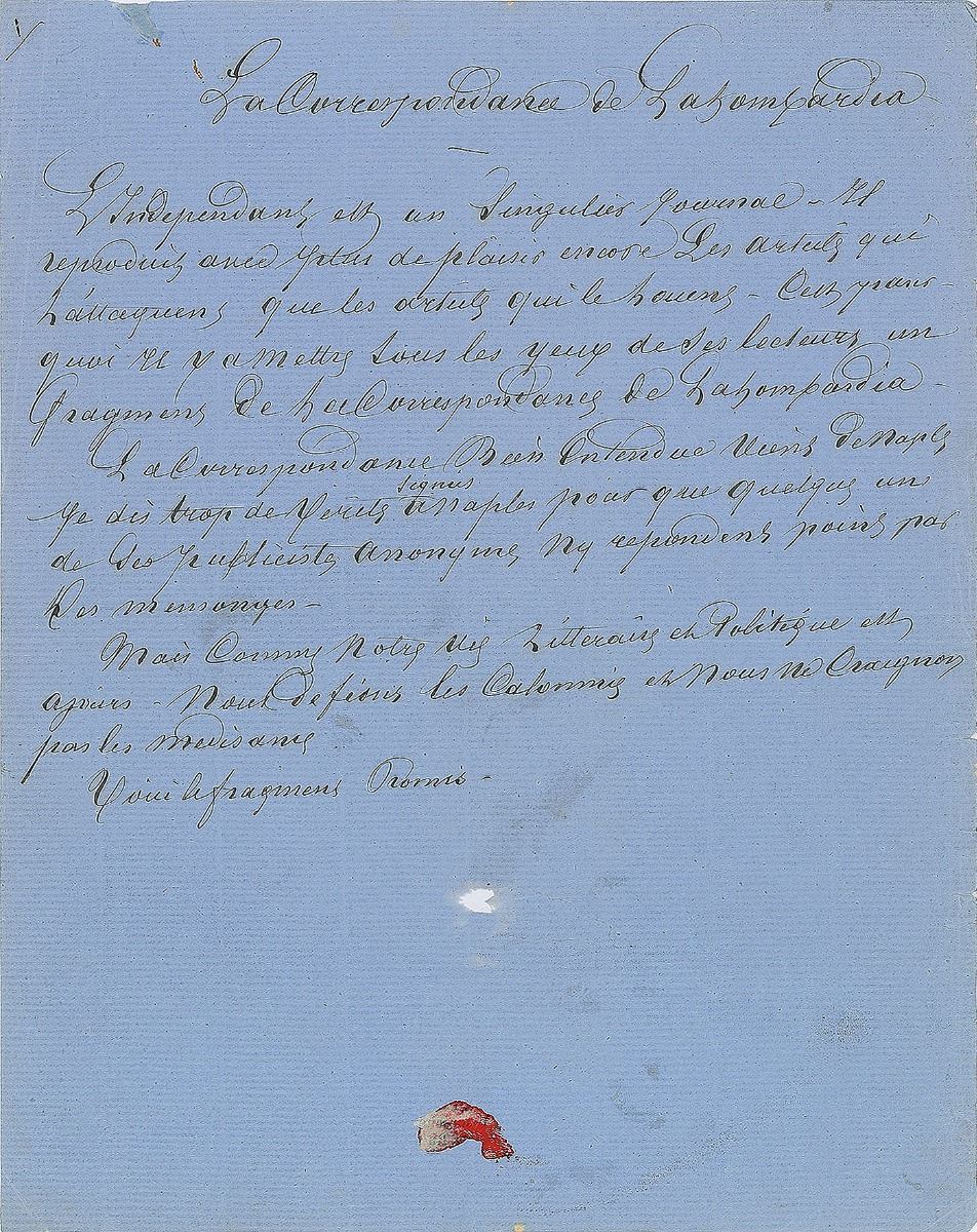 ALS in French, signed “Dumas,” six pages, 8.25 x 10.5, no date but circa 1861–1864. A ‘letter to the editor’ intended for publication in La Lombardia, a newspaper that had printed anonymous accusations of plagiarism against Dumas inspired by the critic Francesco de Sanctis. The first page is headed “La Correspondance de La Lombardia,” and introduces the forthcoming letter, with Dumas first describing on his own newspaper, L’Independant, as “an unusual newspaper that takes more pleasure in printing articles that attack it rather than those that praise it.” He continues, in part (translated): “But since our literary and political life is a matter of public record, we defy calumnies and have no fear of gossip and accusations. Here is the piece I promised you: