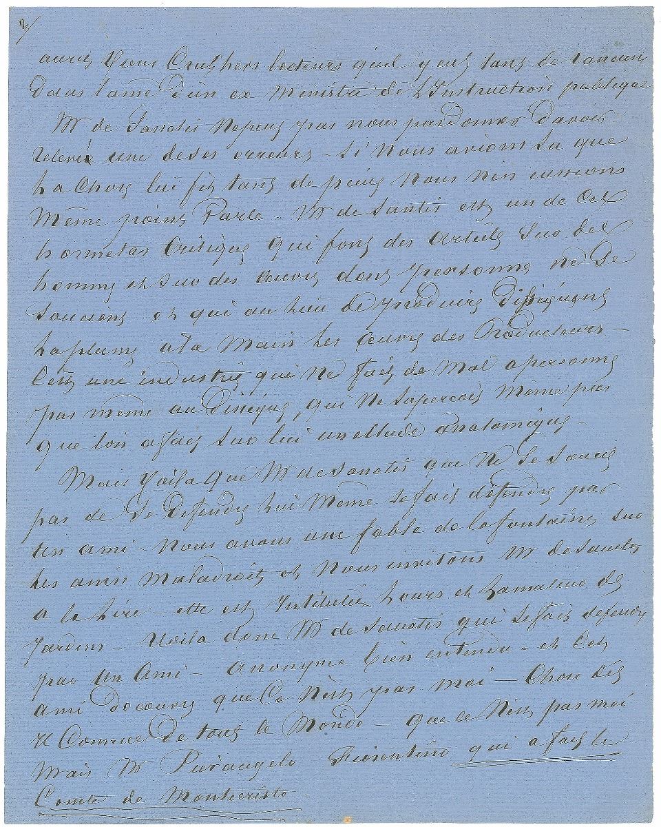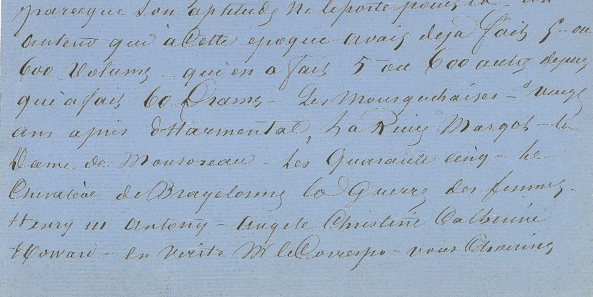 And on the other hand, who was the author who bought Montecristo from a man—who had never written—who wasn’t writing—who will never write a Novel because his talents don’t lie in that area—an author who at that time had already written five or six hundred volumes, who’s written 5 or 600 others since then. An author who has written 60 Dramas—Les Mousquetaires [The Three Musketeers], Vingt ans apres [Twenty Years After], Harmental [The Conspirators], La Reine de Margot [Queen Margot], La Dame de Monsoreau [Chicot the Jester], Les Quarante cinq [The Forty-Five Guardsmen], Le Chevalier de Bragelonne [The Vicomte of Bragelonne], La Guerre des Femmes [The Women's War], Henry III, Antony, Angele, Christine, Catherine Howard—In truth, Mr. Correspondent, Sir, you have made a bad choice as to the seller and an even worse one as to the buyer.