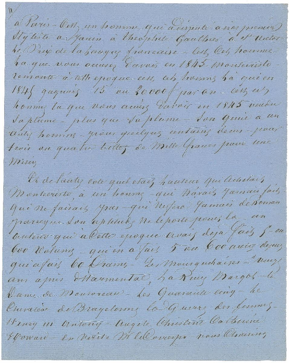 And he is the only man of talent you have, the only one who stands for Southern European intelligence in Paris. He’s a man who rivaled our greatest stylists, Janin, Theophile Gautier, Saint-Victor as a master of the French language. That’s the man you accuse of having sold his pen in 1845—Montecristo dates from then—more than his pen—his genius—sold to another man for a few hundred ecus—for three or four 1,000 franc notes—for a wretched sum. In 1845 that man earned 15,000 or 20,000 francs.