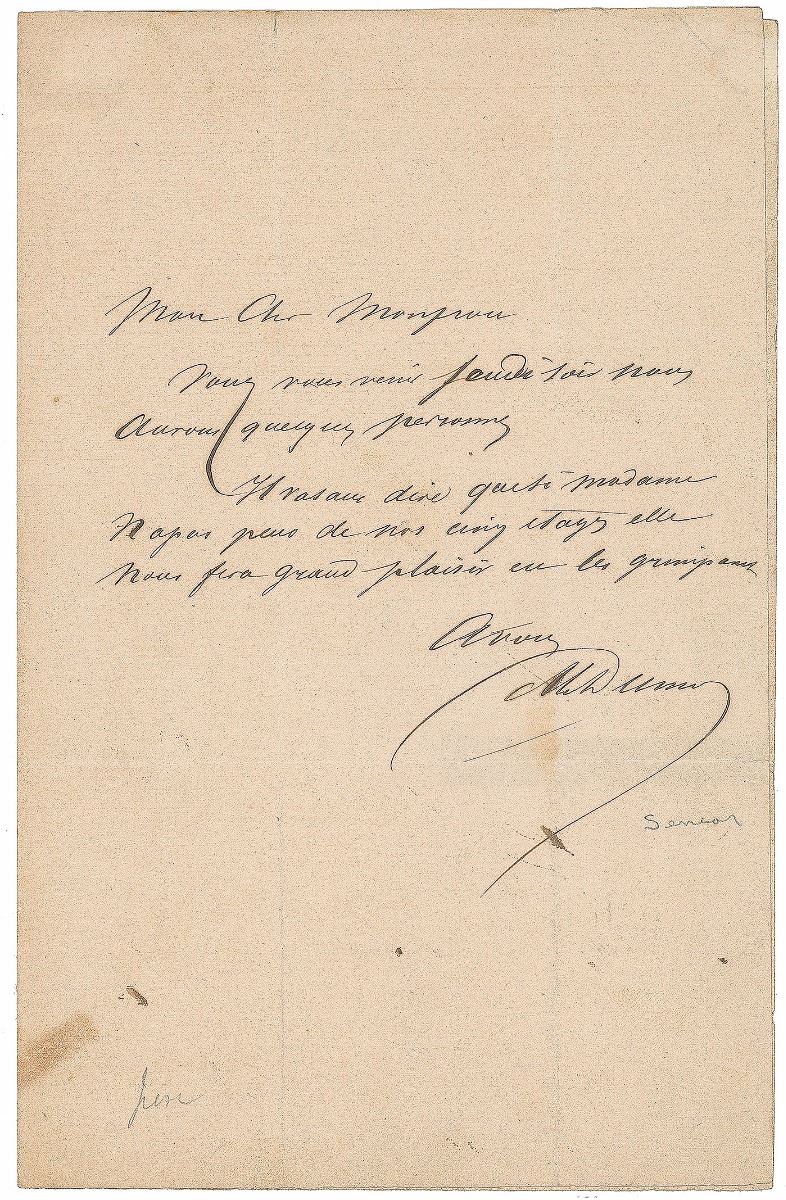 Untranslated ALS in French, signed “Alr. Dumas,” one page, 5.25 x 8, no date but postmarked November 13, 1855. Addressed on the reverse of the second integral page in Dumas’s own hand. In very good to fine condition, with a tape repair to second integral page.