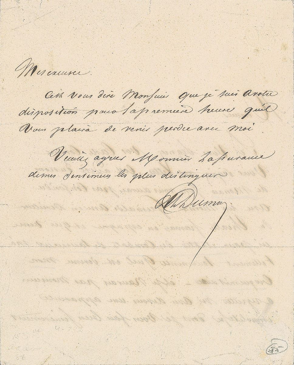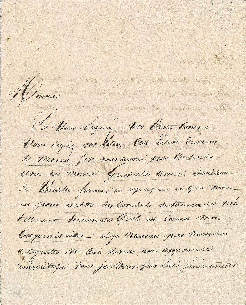 ALS in French, signed “Ale. Dumas,” one page on two adjoining sheets, 4.25 x 5.25, monogrammed personal letterhead, no date. Letter to a gentleman, in part (translated): "If you signed your cards the same as you sign your letters, that is to say, with the name of Monau, I would not have mistaken you as a Monau Grimaldi, the old French Director of the Vicariate in Spain, who came here to establish bull fights, and this has tormented me so much that he became my bogey-man, and I would not have to regret, dear Sir, having rendered to you an impolite approach. I offer to you very proudly my apology and say to you, Sir, that I shall remain at your disposal for the first drink that you may like to share with me.” In fine condition.