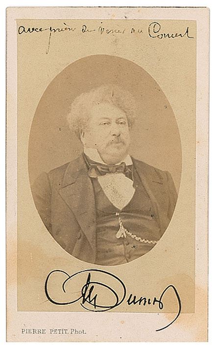 Rare and desirable 2.5 x 4 carte-de-visite portrait of Alexandre Dumas in a distinguished head-and-shoulders pose, signed boldly below the image in black ink, "A. Dumas," who adds an inscription in French above. Published by Pierre Petit of Paris. In very good to fine condition, with light scuffing and a few light stains.