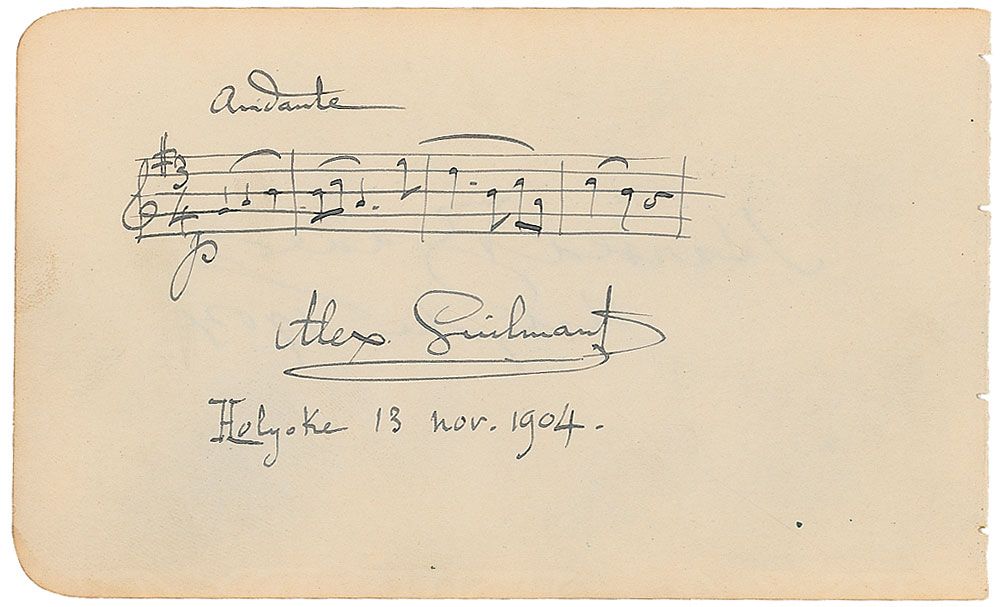French organist and composer (1837–1911). AMQS on an off-white 6 x 3.5 album page. Guilmant pens four bars of music, signing below, “Alex. Guilmant, Holyoke, 13 Nov. 1904.” In fine condition.