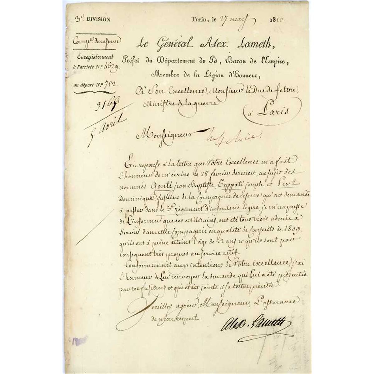 Document signed by Alexandre Lameth, General Rochambeau's aide-de camp during the American Revolution, radical leader during the French Revolution, and General under Napoleon. Lameth, whose proper name was Alexandre-Theodore-Victor, comte de Lameth, here signs a French document dated 1810, the year he was appointed a baron, after having previously been imprisoned for treason. 7.75'' x 11.75'' document is in very good condition with light wear and one fold. Boldly signed ''Alex. Lameth''.