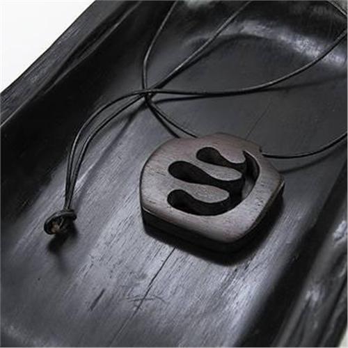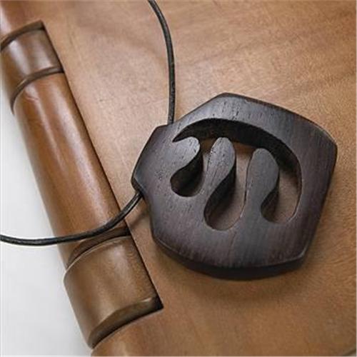 Alexandre Noll<BR>pendant<BR>France, c. 1960<BR>macassar ebony, leather<BR>2.5"dia x .25"h<BR>Carved signature: [ANoll]. Sold with certificate of authenticity from Odile Noll.<BR>Literature: Alexandre Noll, Jean-Elie and Passebon, pg. 126 illustrates similar examples<BR>Provenance: Family of Alexandre Noll<BR><BR><BR><BR>