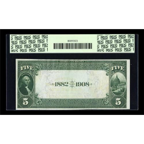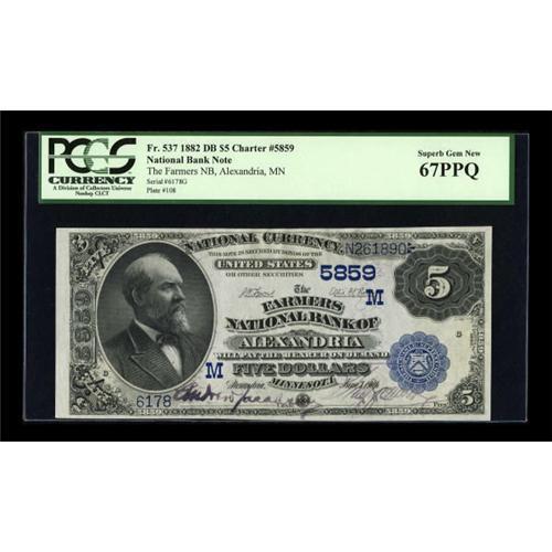 <B>Alexandria, MN</B></I> - $5 1882 Date Back Fr. 537 <B>The Farmers NB</B></I> Ch. # (M)5859<BR> This note is the first of a pair of spectacular $5 1882 Date Backs from the same sheet. The margins are unusually broad for a note of this type and denomination. It's well embossed with very crisp surfaces and dazzling color, and well deserving of its <B>PCGS Superb Gem New 67PPQ </B></I>grade.<BR><BR><b>Shipping:</b> Coins & Currency (<a target="_blank" href="http://www.heritageauctions.com/common/shipping.php">view shipping information</a>)