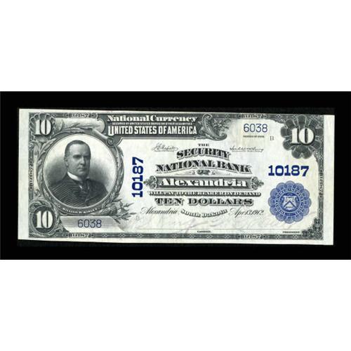 <B>Alexandria, SD</B></I> - $10 1902 Plain Back Fr. 628 <B>The Security NB</B></I> Ch. # 10187<BR> A mere eight notes comprise the entire census from this bank, with this specimen the only one on that list in better than Very Fine. It is listed as CU, which it is not, although it certainly appears new until closely examined. Bright <B>Extremely Fine+,</B></I> a real winner of a note. <BR><BR><b>Shipping:</b> Coins & Currency (<a target="_blank" href="http://www.heritageauctions.com/common/shipping.php">view shipping information</a>)