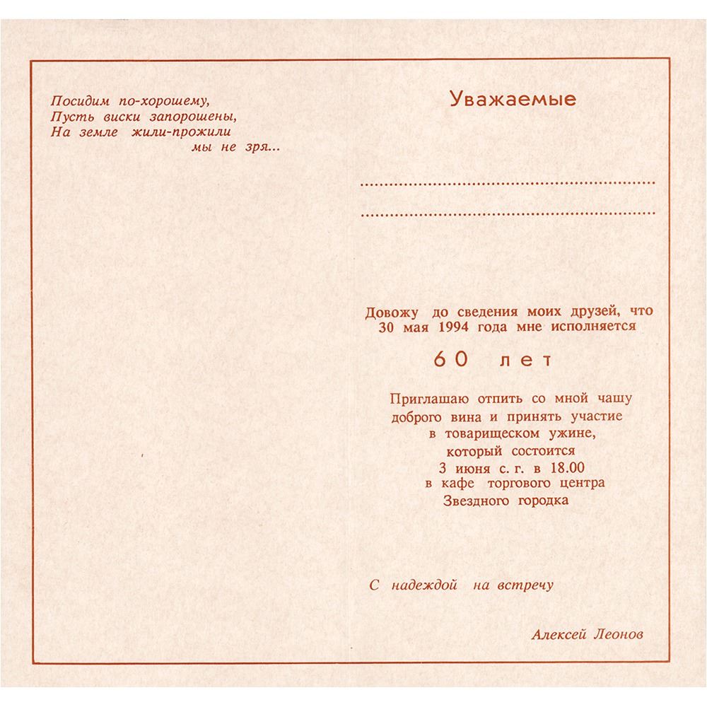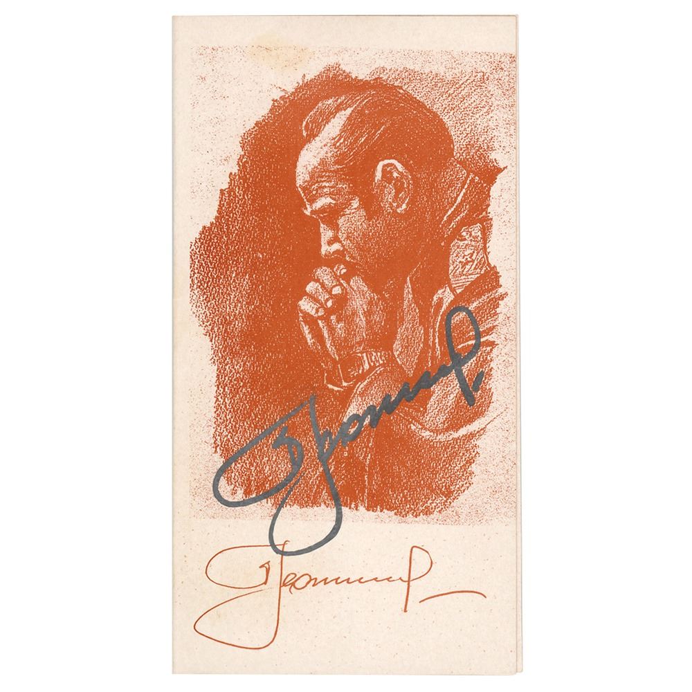 Scarce invitation for the 60th birthday of legendary cosmonaut Alexei Leonov, who personally designed this invitation to be sent out to his close friends and family. The card measures 4 x 7.5 and is signed on the front in silver ink. The interior contains Cyrillic invitation text for a birthday party on May 30, 1994, in the ‘shopping mall of Star City.’ The front also bears an orange preprinted facsimile autograph. In fine condition.