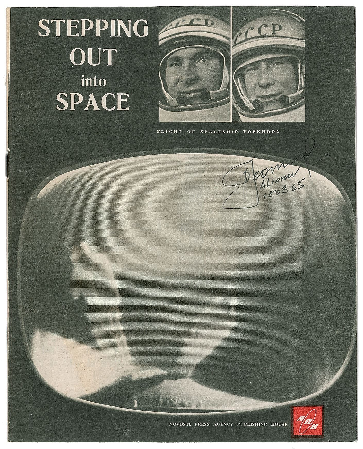 Unusual English booklet entitled "Stepping Out into Space, Flight of Spaceship Voskhod-2," published by the Novosti Press Agency, 14 pages, 7.75 x 9.75, signed on the front cover in black felt tip in Cyrillic and English by Alexei Leonov, adding the date of his flight below, "18 03 65." In fine condition.