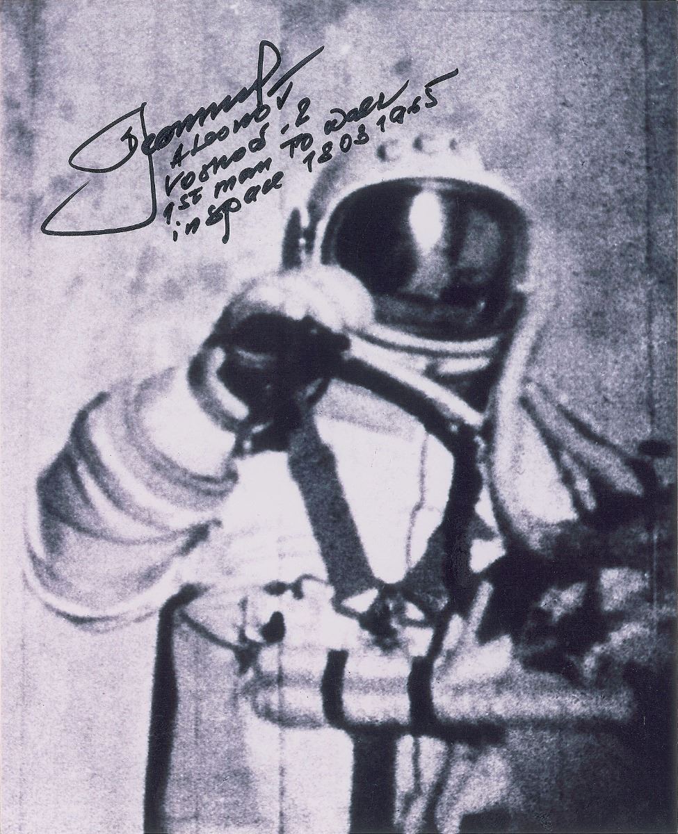 Satin-finish 8 x 10 photo of Leonov during his historic first space walk, signed in black felt tip by Leonov, who adds “Voskod–2, 1st Man Walk in Space, 18 03 1965.” In fine condition, with a grainy quality to the image.