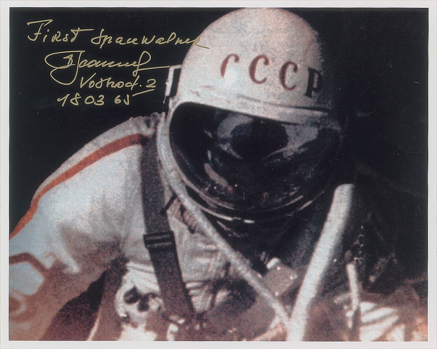 Color satin-finish 10 x 8 photo of Alexei Leonov conducting the first-ever spacewalk, signed in gold ink, adding, "First spacewalker," the mission, "Voskhod 2," and the date, “18 03 65.” In very fine condition.