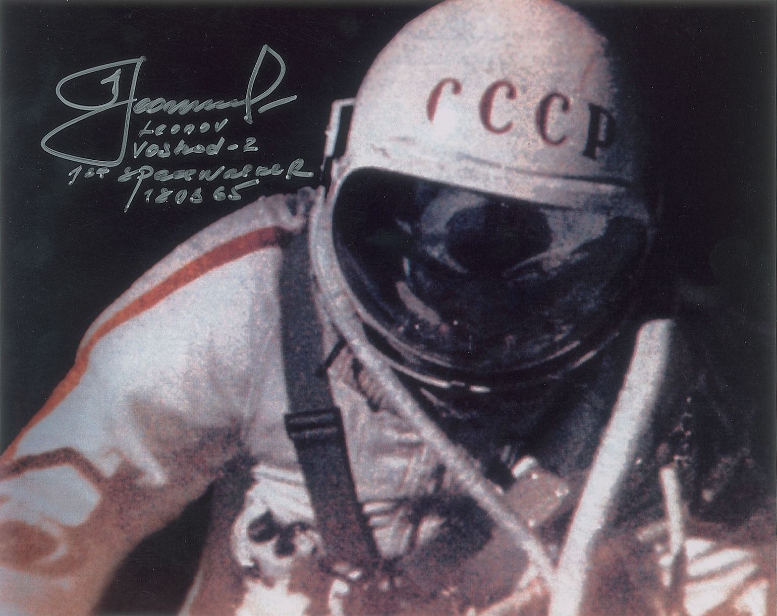 Color semi-glossy 10 x 8 close-up photo of Alexei Leonov conducting the first-ever spacewalk, signed in silver ink, "Leonov, Voskod–2, 1st spacewalker, 18 03 65." In very fine condition.