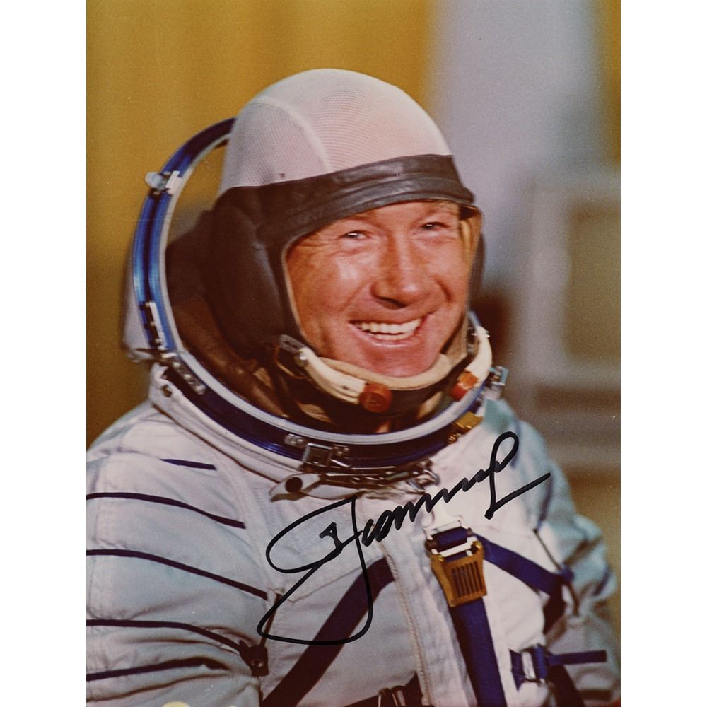 Color glossy 5 x 7.75 photo of Alexei Leonov, the first person to conduct a spacewalk, smiling in his cosmonaut space suit, signed in black felt tip. In very fine condition.