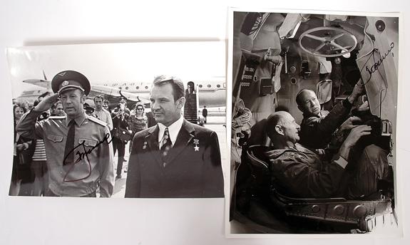 Alexei Leonov-Signed Photos. Lot of 14 different color photos (mostly 8x10 or larger) plus one Soviet patch, all signed by Leonov. All appear to be modern autographs rather than classic autographs, but the vivid colors of the photos more than make up for this. ALSO two different 1969 Soviet newspapers with cosmonaut-related headlines (Soyuz 4, 5, 7). An attractive lot.