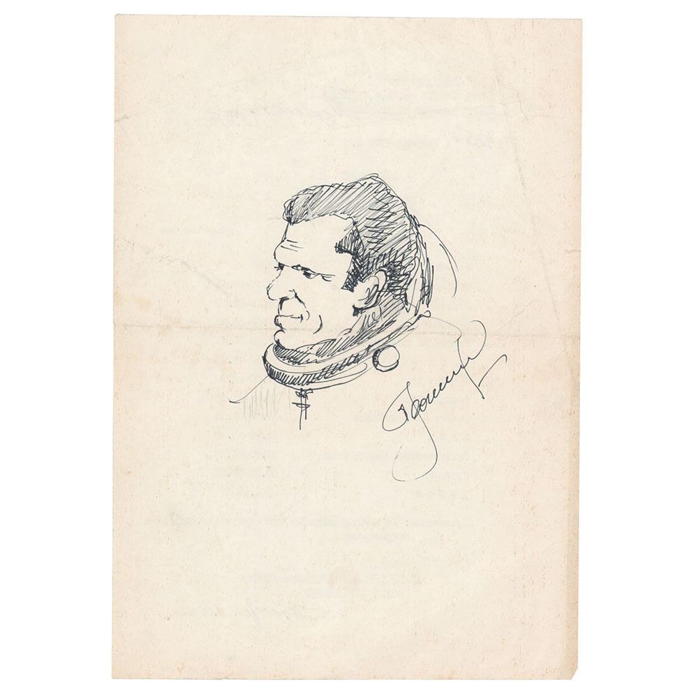 Original felt tip sketch of a self-portrait accomplished by cosmonaut Alexei Leonov on the reverse of an 8.25 x 11.75 cosmonaut training schedule, signed in the lower right by Leonov. The schedule, for cosmonaut activities on February 26, 1978, is signed at the top in ink by Georgy Beregovoy. In very good condition, with overall creasing, a central horizontal fold, and a short tear to the right edge. A unique piece by the cosmonaut-artist.
