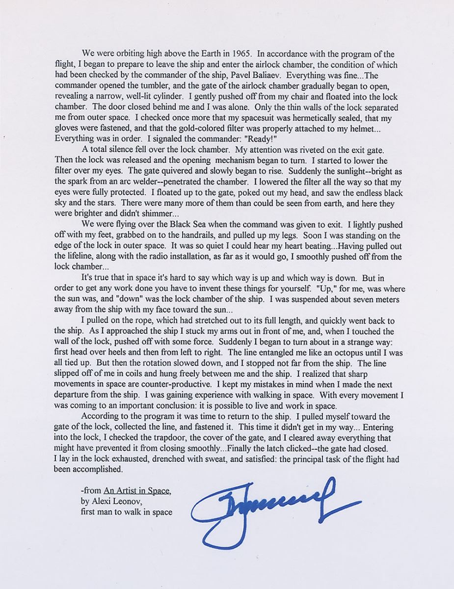 Souvenir typescript, one page, 8.5 x 11, signed at the conclusion in blue felt tip by Leonov. Excerpt from An Artist in Space, in part: “We were orbiting high above the Earth in 1965. In accordance with the program of the flight, I began to prepare to leave the ship and enter the airlock chamber, the condition of which had been checked by the commander of the ship, Pavel Baliaev.” In fine condition.