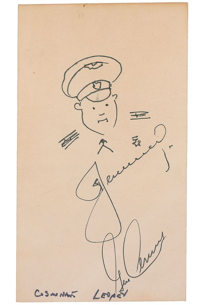 Original signed ink self-portrait, done by Leonov, of himself in his Russian dress uniform, on an off-white 4 x 7 mailing envelope, signed by Leonov and also signed by Gene Cernan. In fine condition, with a uniform shade of mild toning. Sketch originates from the personal collection of Cernan.
