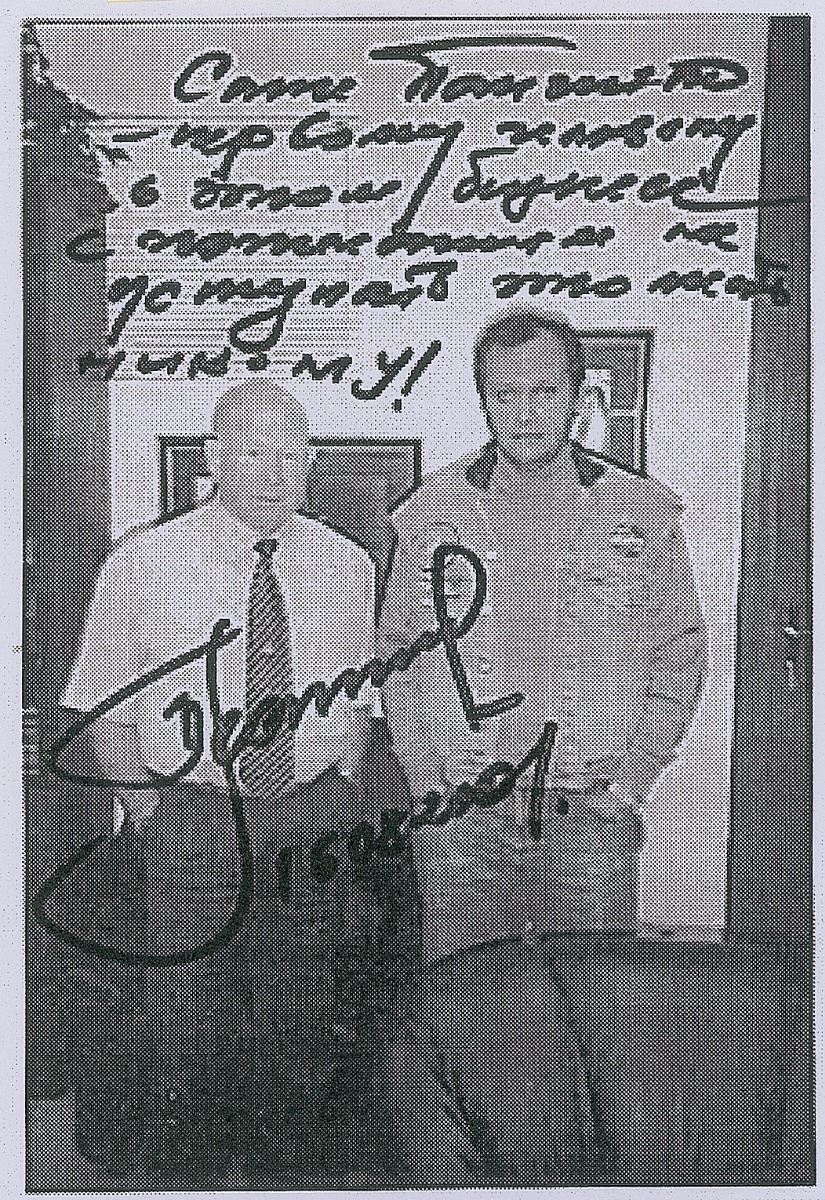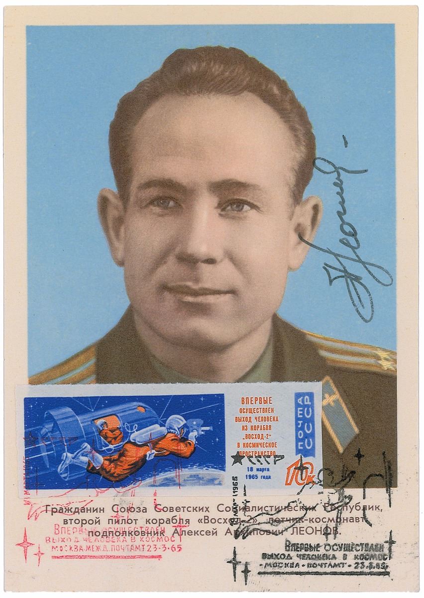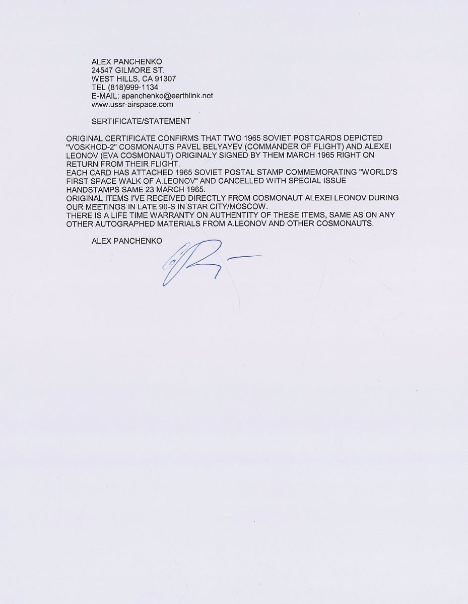 Two color vintage 5 x 5.75 postcard photos of the Voskhod 2 cosmonauts, signed vertically in black ink by Alexei Leonov, and in red ballpoint by Pavel Belyayev. Each postcard bears a commemorative stamp depicting Leonov floating in space outside his spacecraft, and both are postmarked March 23, 1965. In overall fine condition, with trivial wear to edges. Accompanied by a letter of provenance from Alex Panchenko, who includes three printed images of himself posing with Leonov, the original owner of the postcards. An appealing pair of signatures made all the more desirable by the presence of Belyayev, the Voskhod 2 mission commander who died just five years after his historic flight with Leonov.
