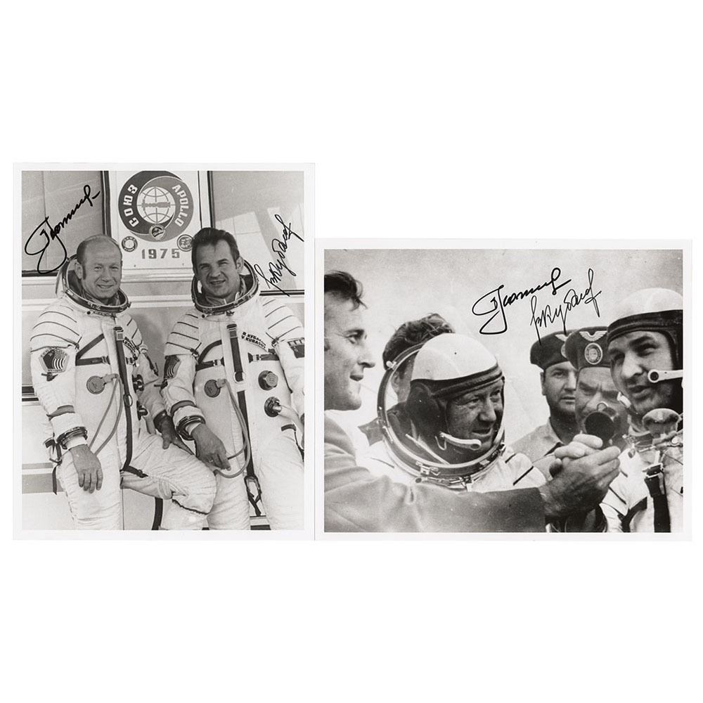 Two glossy photos, 8 x 10 and 10 x 8, picturing and signed in black felt tip by Alexei Leonov and Valeri Kubasov, the two-man Soviet crew of the historic Apollo-Soyuz mission. In overall fine condition.