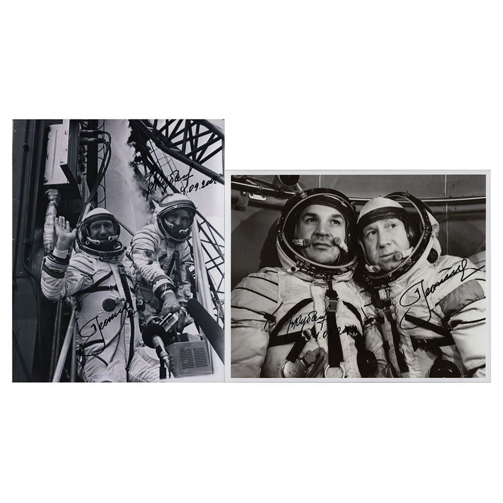 Pair of satin-finish photos of Apollo-Soyuz Test Project cosmonauts Alexei Leonov and Valeri Kubasov in their space suits, 8 x 10 and 10 x 8, both photos are signed by both men in black felt tip. In overall fine condition, with a few small creases.
