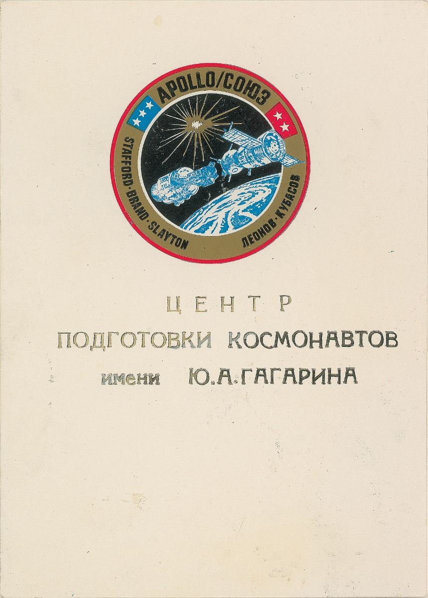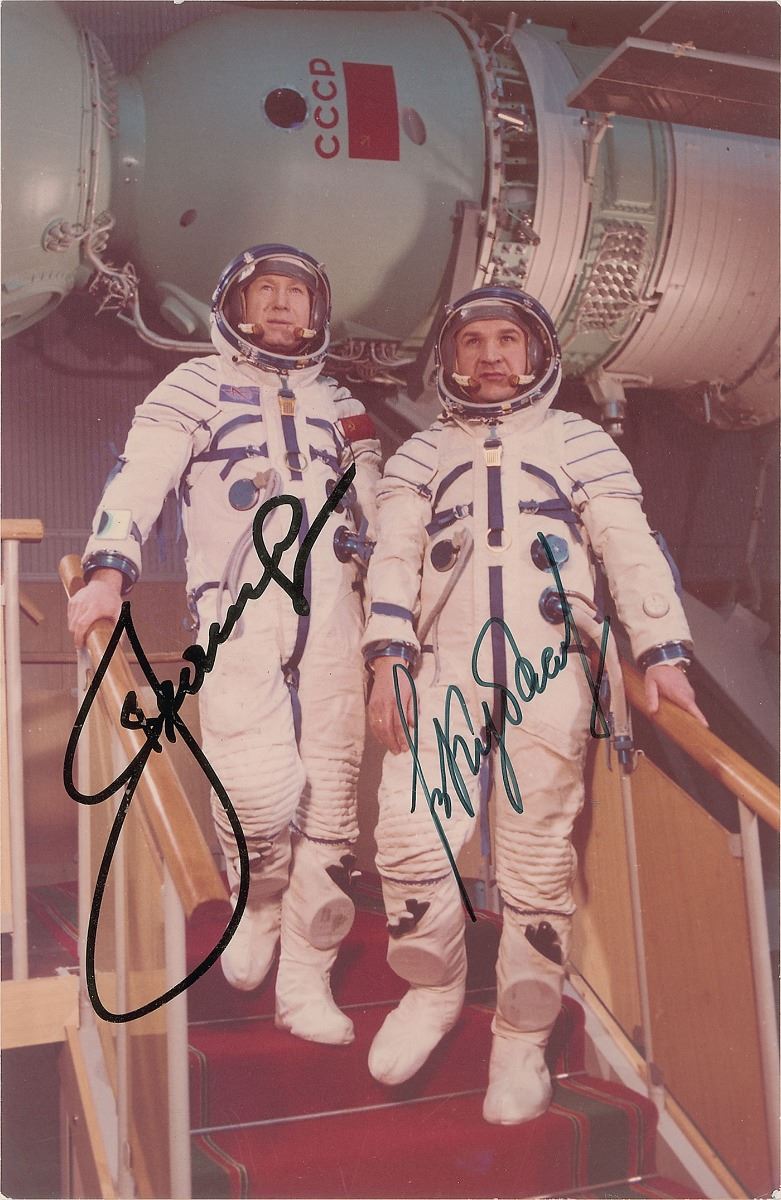 Seldom-seen color glossy 4.5 x 7 full-length photo of the Soyuz 19 crew posing in their space suits, signed in black felt tip by Alexei Leonov and Valeri Kubasov. In fine condition. Accompanied by the original Apollo–Soyuz Test Project presentation folder. Originating from the Astronaut Scholarship Foundation, a portion of the proceeds for the sale of this item will be donated to the ASF.