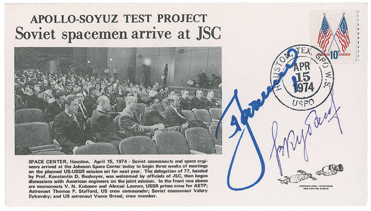 Commemorative cover with a cachet honoring the arrival of the Soyuz cosmonauts as part of the 1975 Apollo-Soyuz mission, signed in ink by both Russian crew members, Alexei Leonov and Valeri Kubasov. In fine condition.