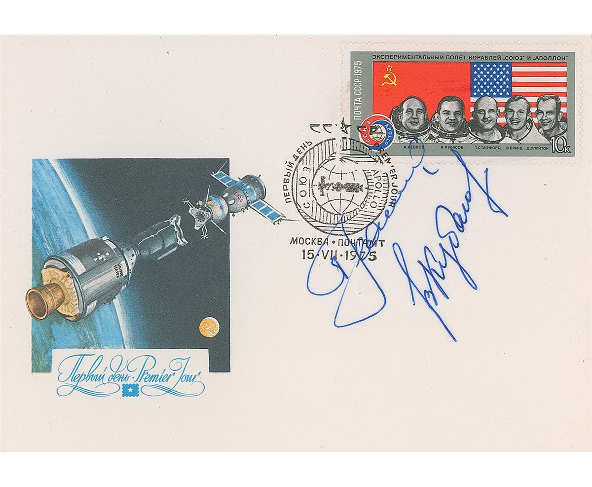 Choice commemorative cover with a cachet honoring the Apollo–Soyuz Test Project docking of American and Soviet spacecraft, signed in blue ballpoint by cosmonauts Alexei Leonov and Valeri Kubasov. In fine condition.