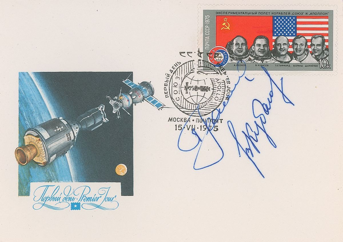 Choice commemorative cover with a cachet honoring the Apollo–Soyuz Test Project docking of American and Soviet spacecraft, signed in blue ballpoint by cosmonauts Alexei Leonov and Valeri Kubasov. In fine condition.