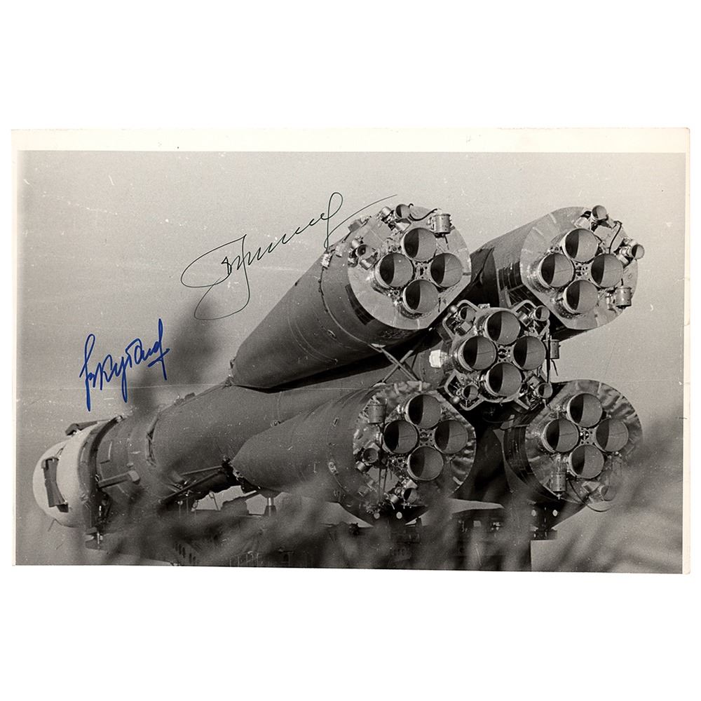 Glossy 11.75 x 7.5 photo of the Soyuz-U launch vehicle being transported by rail to the Baikonour launch site for the Apollo-Soyuz mission, signed in blue and black felt tip by cosmonauts Alexei Leonov and Valery Kubasov. In very good to fine condition, with trimmed edges and some very short edge tears.