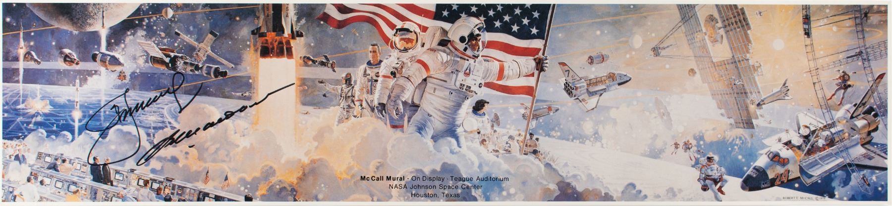 Attractive color glossy 24.25 x 5.5 panoramic photo print of Robert McCall’s gorgeous 1979 mural painting entitled ‘Opening the Space Frontier—The Next Giant Step,’ which depicts astronauts, spacecraft, and moments from NASA’s various historic programs, signed in black felt tip by cosmonauts Alexei Leonov and Vladimir Shatalov. In fine condition.